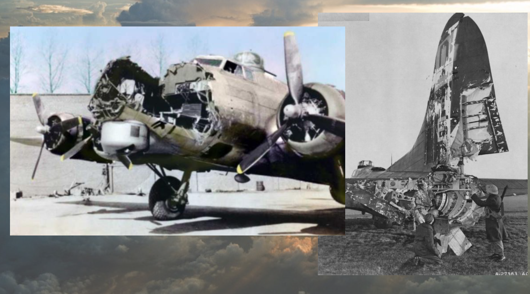 Loving the B-17: Its partner among heavy bombers, the B-24, was a little faster, carried a bigger payload and had a longer range, and there were more of them. But the B-24 lacked the B-17’s graceful Art Deco lines and it was a beast to fly—an analogy might be that the B-24 lacked the B-17’s “power steering,” and pilots of the former sometimes lost five to ten pounds on a typical mission. But the B-17’s most admirable trait may have been its ability to absorb punishment. Maj. Cleven is stunned by the damage German explosive shells (flak) have done to his ship on his return to the airfield at Thorpe Abbots. These planes returned home, too.