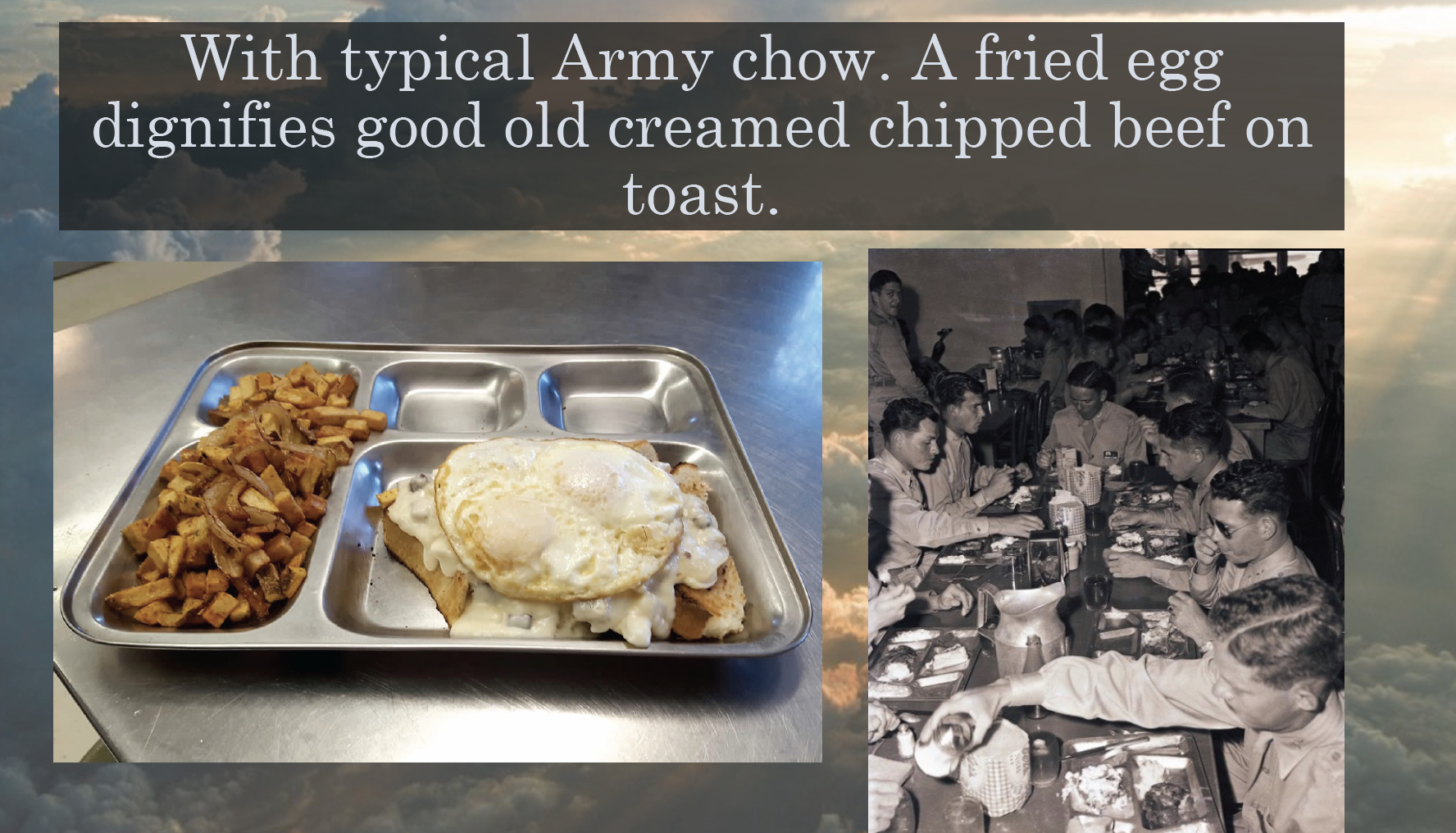 ...[E]en in the AAF, the green-hued powdered eggs, along with the ubiquitous Spam, were breakfast standards, and creamed chipped beef on toast—referred to as “shit on a shingle”—followed airmen across the Atlantic from the air bases stateside where they’d first encountered what seemed to be, to the military, a perverse culinary masterpiece.