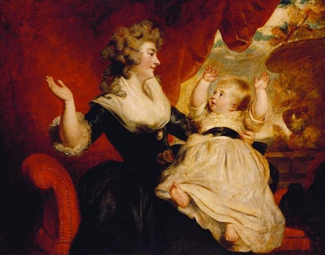 Despite all of this, Georgiana would be remembered as a loving friend and mother, good-humored and devoted to the poor, especially children. Good for her. She was also beautiful: here she is, in 1786, with one of her daughters, and, again, portrayed by the many-wigged Knightley.