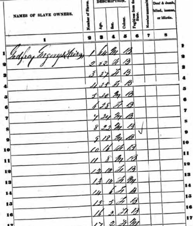 Margaret’s husband and GW’s father, Godfrey Gregory, claimed to own the human beings in the 1850 Kentucky census below. They have no names, of course.