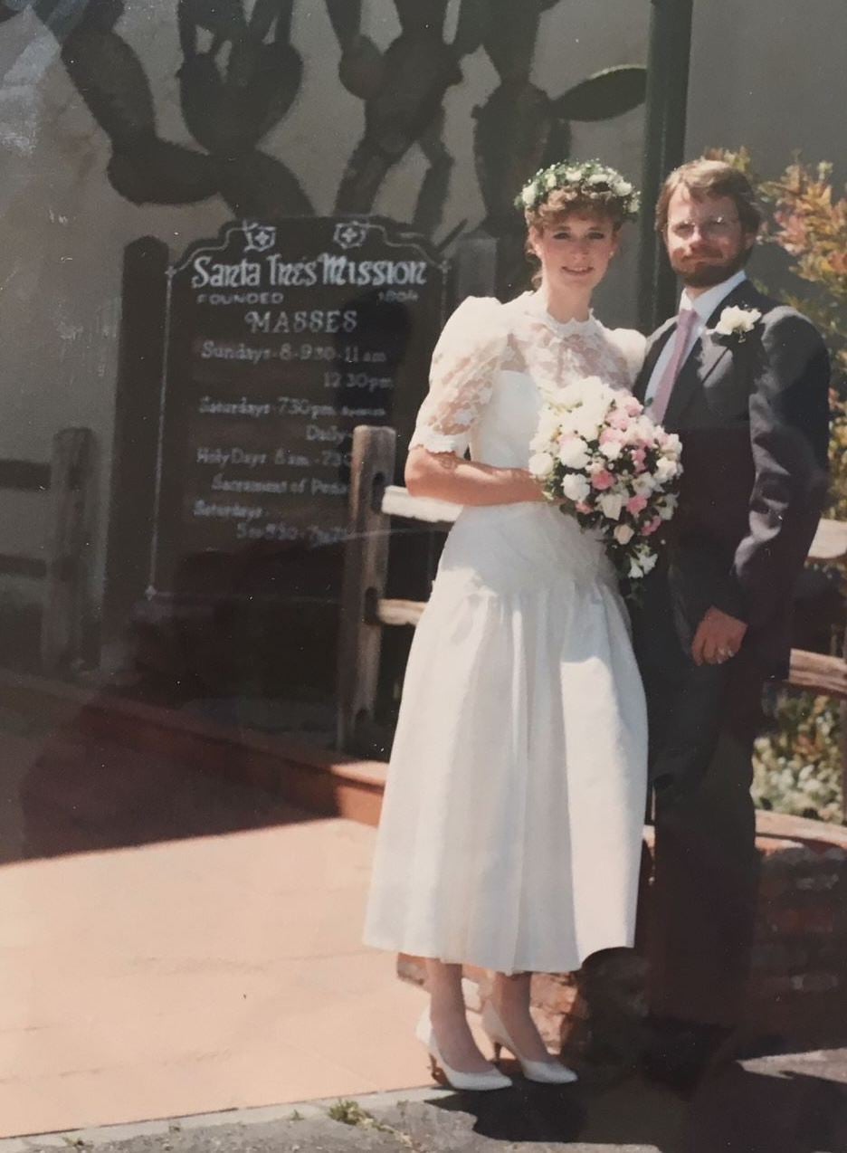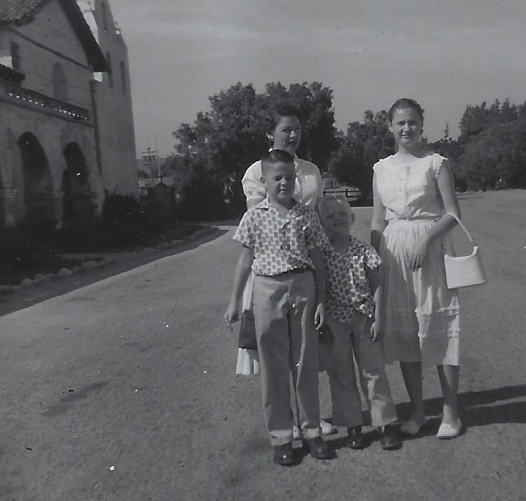 I passed fourth grade, despite that project. The historic coincidence? Here are Mom, Roberta, Bruce and me visiting Mission Santa Ines about 1960. Twenty-six years after that photo was taken, and twenty-four after my Mission Santa Ines fourth-grade project, my wife Elizabeth and I were married there.