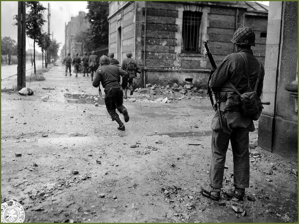By the way, Cherbourg has ties to San Luis Obispo County history, too. In June 1944, Jack Langston of Shandon lost his life over the city when German batteries brought down his fighter, a P-38 that would’ve looked exactly like the one in the photo. He was never found. Far below, the 79th Infantry Division was fighting street to street, a terrible thing for a foot soldier to endure. One of them, a San Luis Obispo County farmworker, Domingo Martinez, was there; the 79th secured Cherbourg but Martinez was killed in the bocage beyond the city in July. My students and I found his grave at the American Cemetery above Omaha Beach on a 2010 visit.