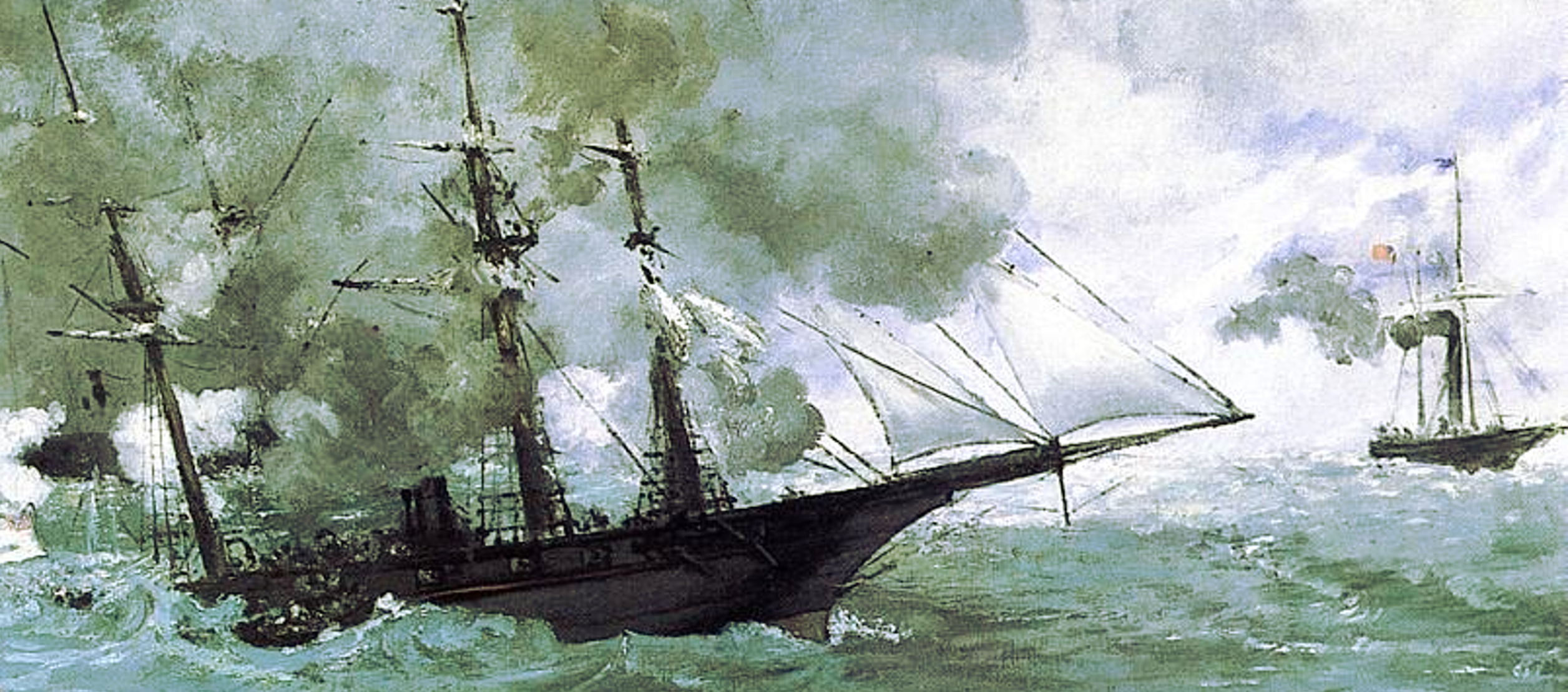 Edouard Manet painted the battle; below is his painting and a detail from it. A little rescue boat heads for Alabama as she begins her final plunge.