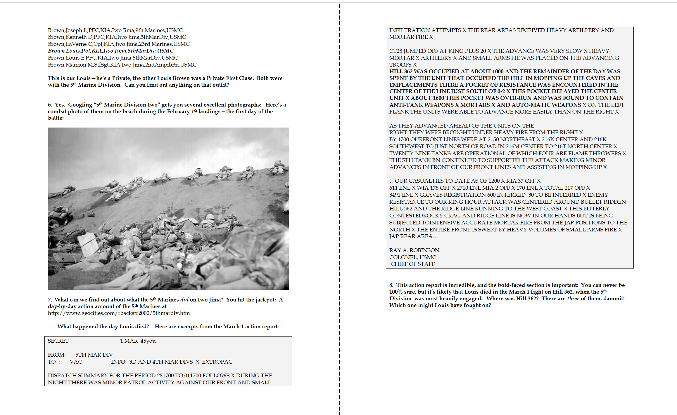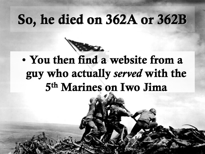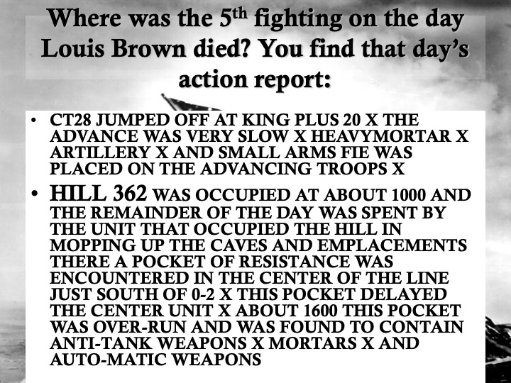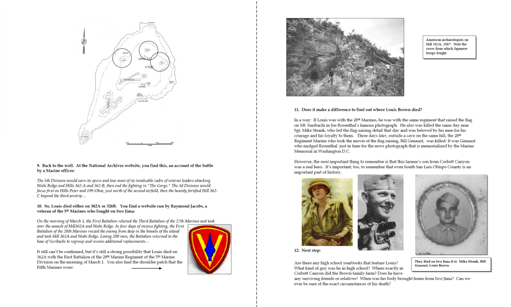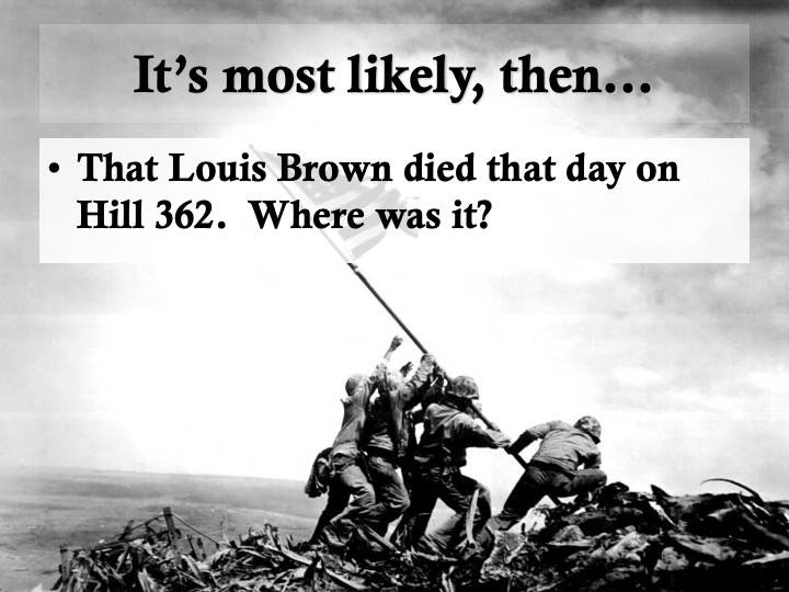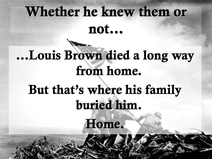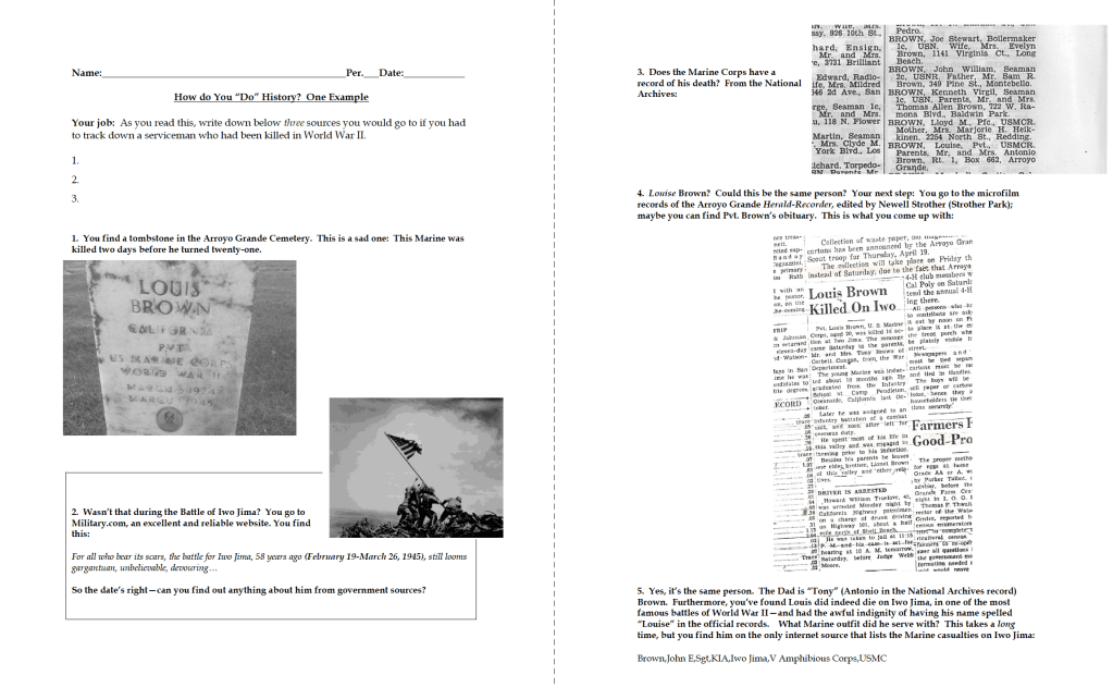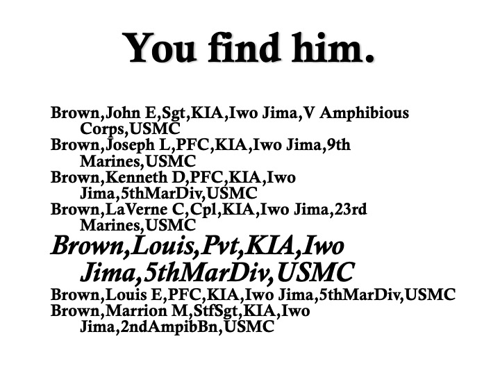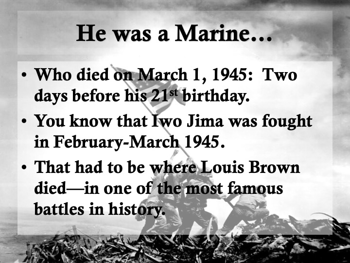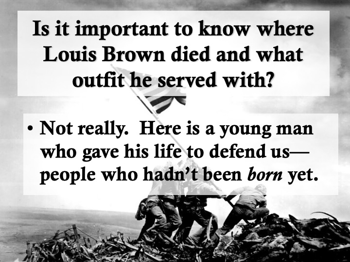 I owe Pvt. Louis Brown so much for many reasons. In my history classes, I wanted my students to learn the basics of research, including forensic study of a battlefield (The Little Bighorn) and using deductive reasoning to analyze a murder scene (the Lizzie Borden home) so that they could begin to appreciate how historians think. So the sad business of finding this young man’s tombstone inspired a lesson plan. I walked students through the steps of researching a World War II combatant—may they might research an ancestor someday—by modeling what I’d done, in a series of PowerPoint slides: