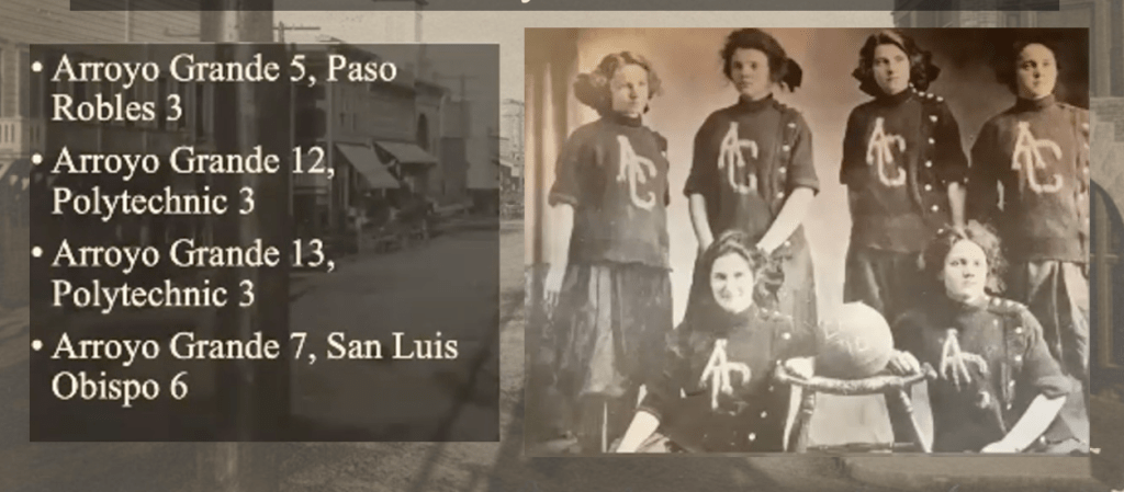 There was no Title IX in 1910, but Arroyo Grande Union High School did have a women’s basketball team. The were 4-0–not, not a big season, and the scores indicate that the baskebtball spent a lot of time on the ground (“ground,” not “floor.” No AGUHS gym until 1937), but they had uniforms and they had a reputation and the newspapers covered their games. And we have this marvelous photo from the Bennett-Loomis Archives.
