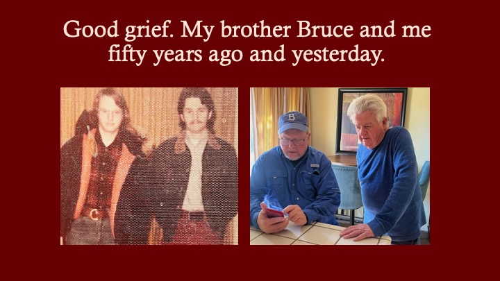 There used to be records called “45’s,” young people, that you popped onto what was called a “turntable” inside the listening booth at Brown’s Music in San Luis Obispo. Since my big brother, Bruce, had four years and a driver’s license on me, he would bring 45’s home and play them in the back bedroom–the back back back bedroom—of our house in rural Arroyo Grande.