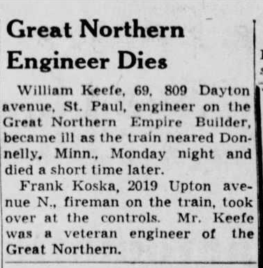 I’m not arguing here in favor of death. But on this day in 1948, my mother’s uncle, Willie Keefe, died at the controls of this engine, the Great Northern’s Empire Builder. (Three days later, my big brother, Bruce Keefe Gregory, was born. He inherited the Keefes’ brown eyes, the only one of the four of us.)