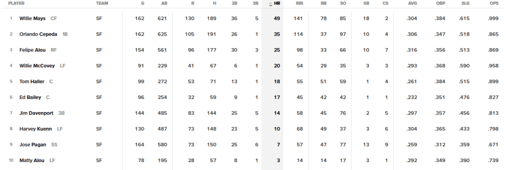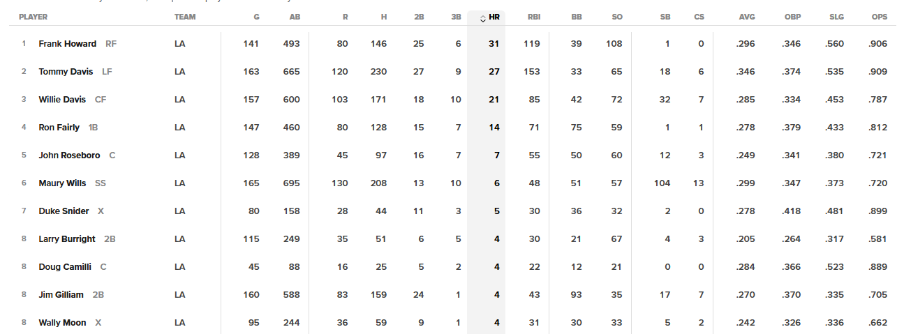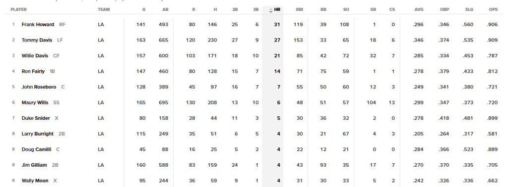 And, as a Dodger fan, nothing was more terrifying to me than the #3 and cleanup spots in that lineup, with the right-handed Mays and the left-handed Willie McCovey. That started in 1961; McCovey was hurt in 1962 but those places in the lineup remained between 1963 and 1968 and came back once more in 1971.