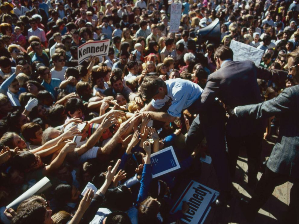 The torch was carried into the Coliseum by onetime decathlete Rafer Johnson, a simply beautiful man who’d been one of Bobby Kennedy’s bodyguards in 1968. Johnson, L.A. Ram Roosevelt Grier or the Secret Service had to hold onto Kennedy by the waist or hold tightly onto his belt to keep the crowds–neither Trump nor Harris could top those crowds–from kind of absorbing him.