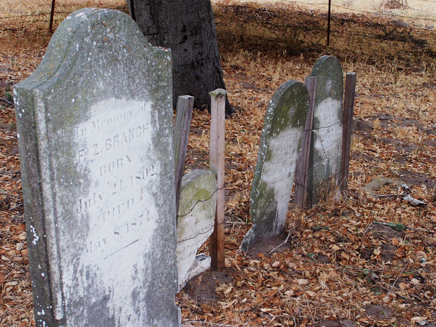 Just over the hill was a little family cemetery that contained the graves of the Branch family, rancheros and founders of Arroyo Grande. Mr. Branch, who died in 1874, is buried beside three daughters, all taken by smallpox in the summer of 1862. And nearby are the graves of a father and son, suspected killers, lynched from a railroad trestle over the creek in 1886.