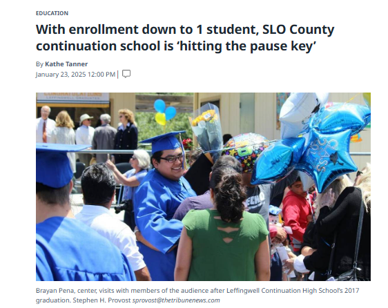 Kathe Tanner covers the North Coast for the Tribune, my old (if brief) paper from many years ago, and she is excellent. This story made me a little sad. I’m hoping Leffingwell’s closing is a mere demographic blip, soon to be restored by a few more students who deserve a school like this.