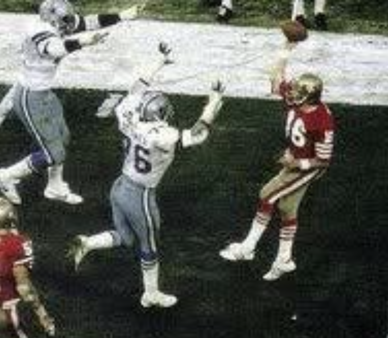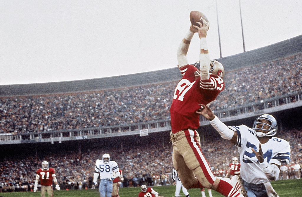 And when the boys were little, we went to TWO Niners games. One was an Old Timers’ Day, and when they paraded down to the field, EVERY LAST ONE OF THEM WAS LIMPING. Check that. One wasn’t. It was this guy. You know, the one who threw the pass to the late, great Dwight Clark.