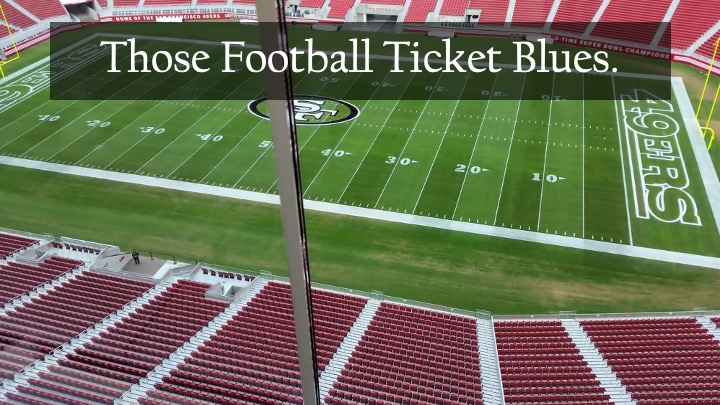 Four tickets just below the landing gear of the jets coming into the San Jose airport (DUCK!), and on the visitors’ side, where the Niners look like little red Mexican jumping beans? $500.