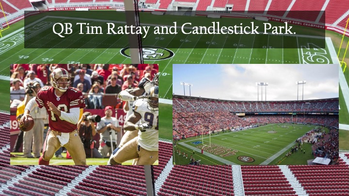 The Glory Days were long gone in 2004, when we saw soon-to-be-forgotten QB Tim Rattay take on the Arizona Cardinals. The Niners that year won only two games. *Gloom.* They were down 28-12 at the half, but Rattay, playing in Candlestick, started completing passes, among 400 yards of them, that would begin to shift the tide.