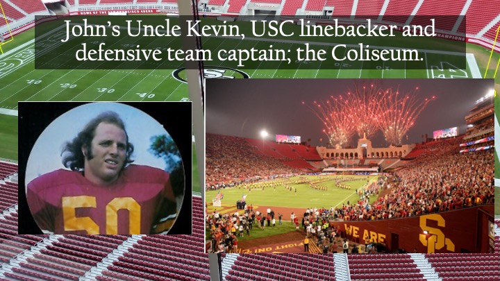We’ve also done a college football game. John’s late Uncle, Kevin Bruce, was a runty longhair linebacker who played for three Rose Bowl teams in the 1970s, for John McKay. He hit opposing players so hard that his helmet left a permanent dent in the bridge of his nose. This, and I suppose his frequent bleeding, impressed the hell out of his teammates, and he became a defensive team captain.