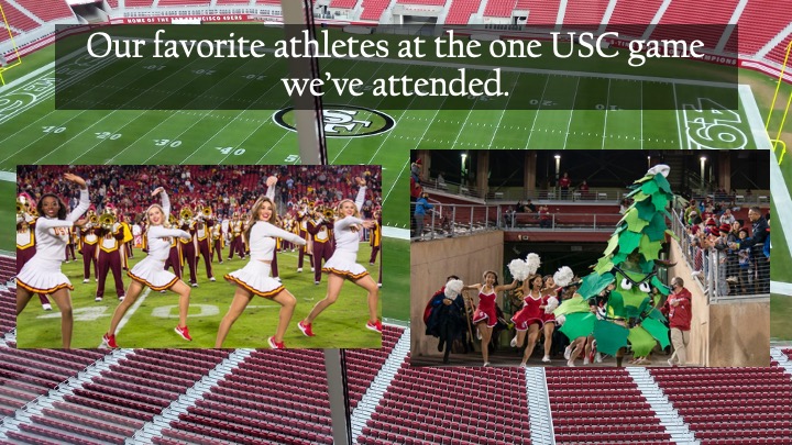 But we came away impressed with athletes who were NOT football players. The Stanford Dancing Redwood Tree was manic but kind of endearing. He/she never stopped moving.Neither did the USC Songleaders. They were INCREDIBLE!