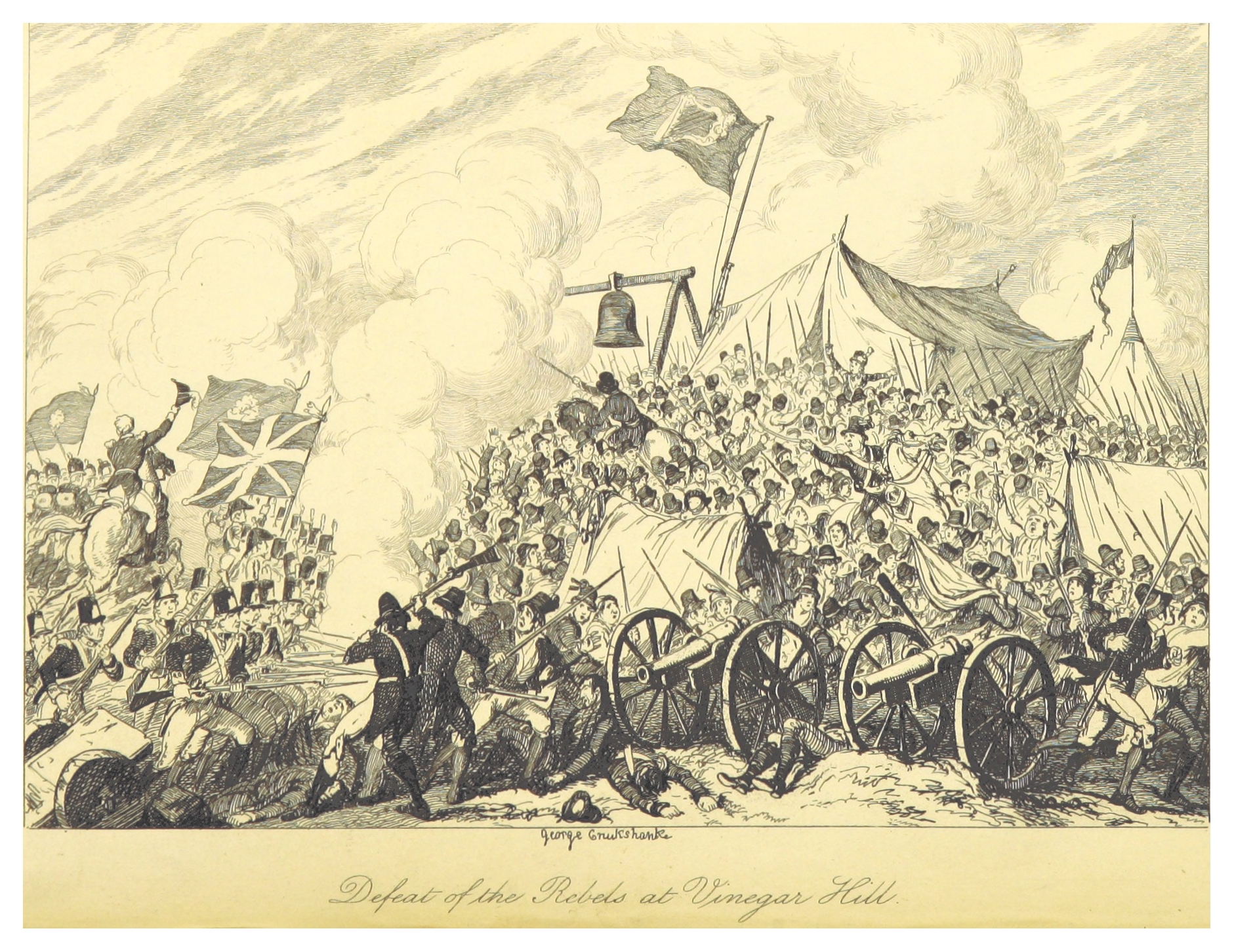 Today is a sad day for Irish nationalism. The culmination of the Wolfe Tone rebellion in 1798—planned with the hope that the French would intervene against England—was a humiliating defeat at the Battle of Vinegar Hill, June 21, 1798. The illustration below, by an artist George Cruikshank, depicts the defeated Irish (1,200 dead and wounded to England’s 100) and they are terrified. Justly so. British soldiers were disciplined, trained with brutality, and so remorseless. The Americans, twenty years before, had the magic formula, including foreign help, which the French provided—but half-heartedly—to the rebels like those who died that day.