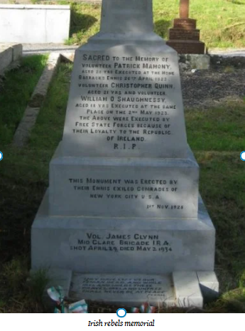 Maybe it’s typical that this memorial was made possible by expatriates, Irish living comfortably and happily distant in New York. What it commemorates might be too painful to remember for the people who live in Ennis today. The four Irish Republican Army men cited on this monument were killed in the Civil War that followed the Republic’s creation, but not by the English. Three of the four were shot by firing squads made up of fellow Irishmen during the Civil War of 1922. Two were eighteen years old. They were Republicans executed by soldiers of the Irish Free State, the government that shot three times as many Irish revolutionaries in 1922 as the English had during the rising of 1919-1921.
