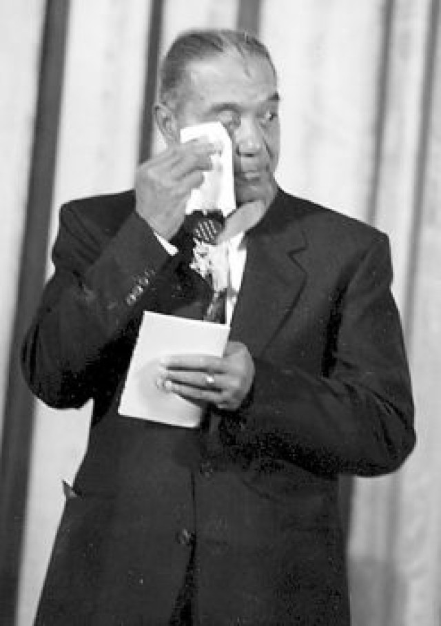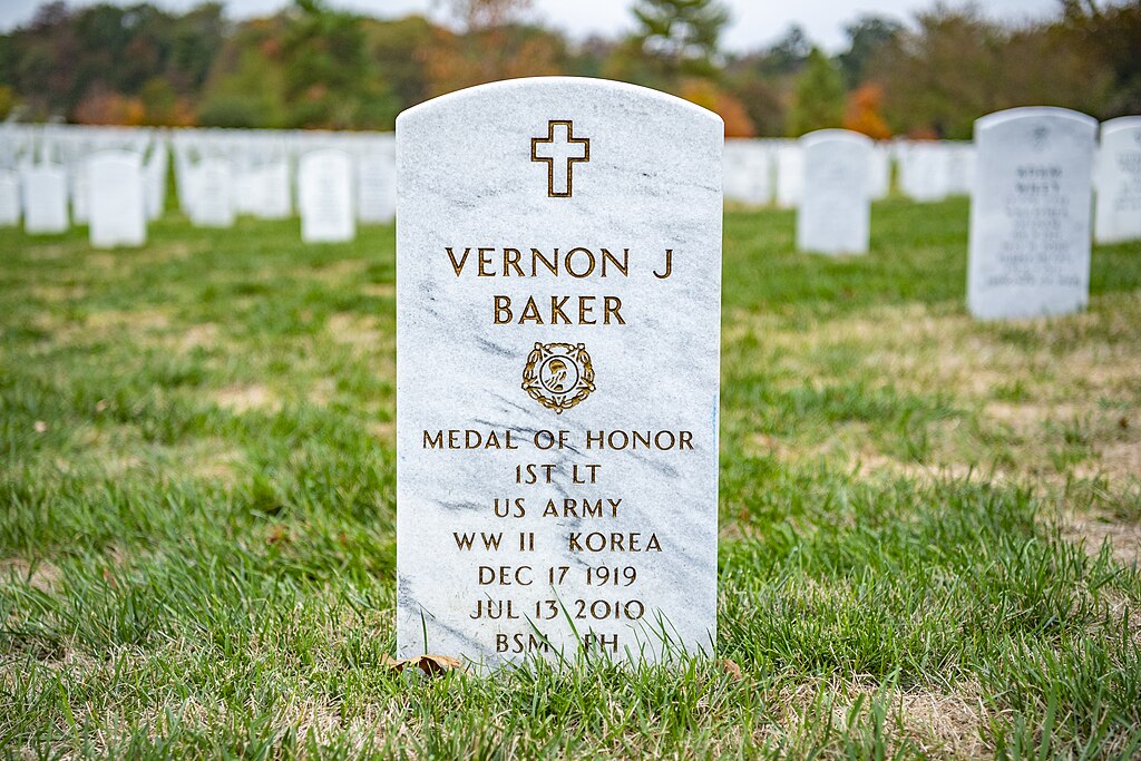 For conspicuous gallantry and intrepidity at the risk of his life above and beyond the call of duty: First Lieutenant Vernon J. Baker distinguished himself by extraordinary heroism in action on 5 and 6 April 1945. At 0500 hours on 5 April 1945, Lieutenant Baker advanced at the head of his weapons platoon, along with Company C’s three rifle platoons, towards their objective, Castle Aghinolfi – a German mountain strong point on the high ground just east of the coastal highway and about two miles from the 370th Infantry Regiment’s line of departure. Moving more rapidly than the rest of the company, Lieutenant Baker and about 25 men reached the south side of a draw some 250 yards from the castle within two hours. In reconnoitering for a suitable position to set up a machine gun, Lieutenant Baker observed two cylindrical objects pointing out a slit in a mount at the edge of a hill. Crawling up and under the opening, he stuck his M-1 into the slit and emptied the clip, killing the observation post’s two occupants. Moving to another position in the same area, Lieutenant Baker stumbled upon a well-camouflaged machine gun nest, the crew of which was eating breakfast. He shot and killed both enemy soldiers. After Captain John F. Runyon, Company C’s Commander joined the group, a German soldier appeared from the draw and hurled a grenade which failed to explode. Lieutenant Baker shot the enemy soldier twice as he tried to flee. Lieutenant Baker then went down into the draw alone. There he blasted open the concealed entrance of another dugout with a hand grenade, shot one German soldier who emerged after the explosion, tossed another grenade into the dugout and entered firing his sub-machine gun killing two more Germans. As Lieutenant Baker climbed back out of the draw, enemy machine gun and mortar fire began to inflict heavy casualties among the group of 25 soldiers, killing or wounding about two-thirds of them. When expected reinforcements did not arrive, Captain Runyon ordered a withdrawal in two groups. Lieutenant Baker volunteered to cover the withdrawal of the first group, which consisted mostly of walking wounded, and to remain to assist in the evacuation of the more seriously wounded. During the second group’s withdrawal, Lieutenant Baker, supported by covering fire from one of the platoon members, destroyed two machine gun positions (previously bypassed during the assault) with hand grenades. In all, Lieutenant Baker accounted for nine enemy dead soldiers, elimination of three machine gun positions, an observation post, and a dugout. On the following night, Lieutenant Baker voluntarily led a battalion advance through enemy mine fields and heavy fire toward the division objective. Lieutenant Baker’s fighting spirit and daring leadership were an inspiration to his men and exemplify the highest traditions of the military service.