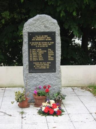 In the 1990s, Alan Magee returned to France for the unveiling of this memorial to the crew of “Snap! Crackle! Pop!”
