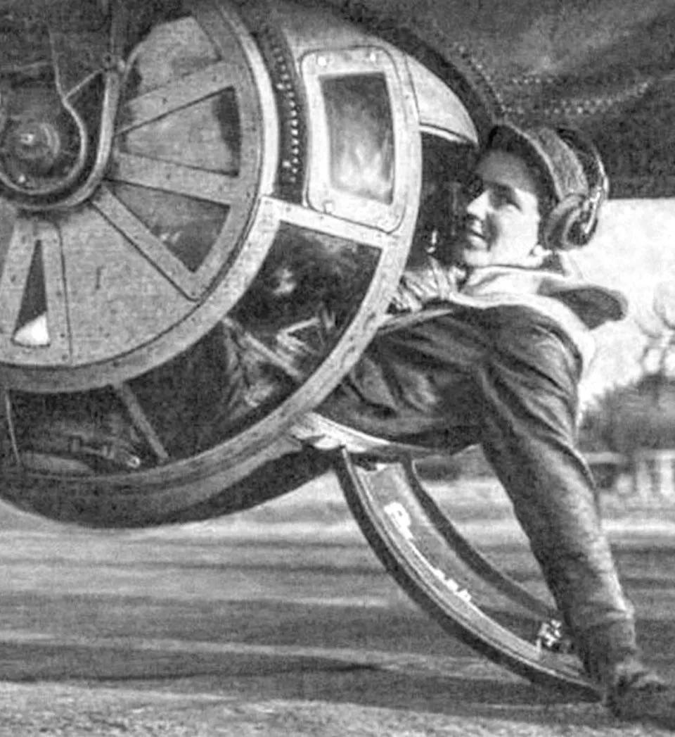 Since Magee was a ball-turret gunner, that meant he was the tiniest of the nine men he flew with. Only a small man could fit in the bubble beneath the B-17. An electrical motor rotated the turret; the exit hatch, however could only be opened from inside the B-17’s fuselage, .