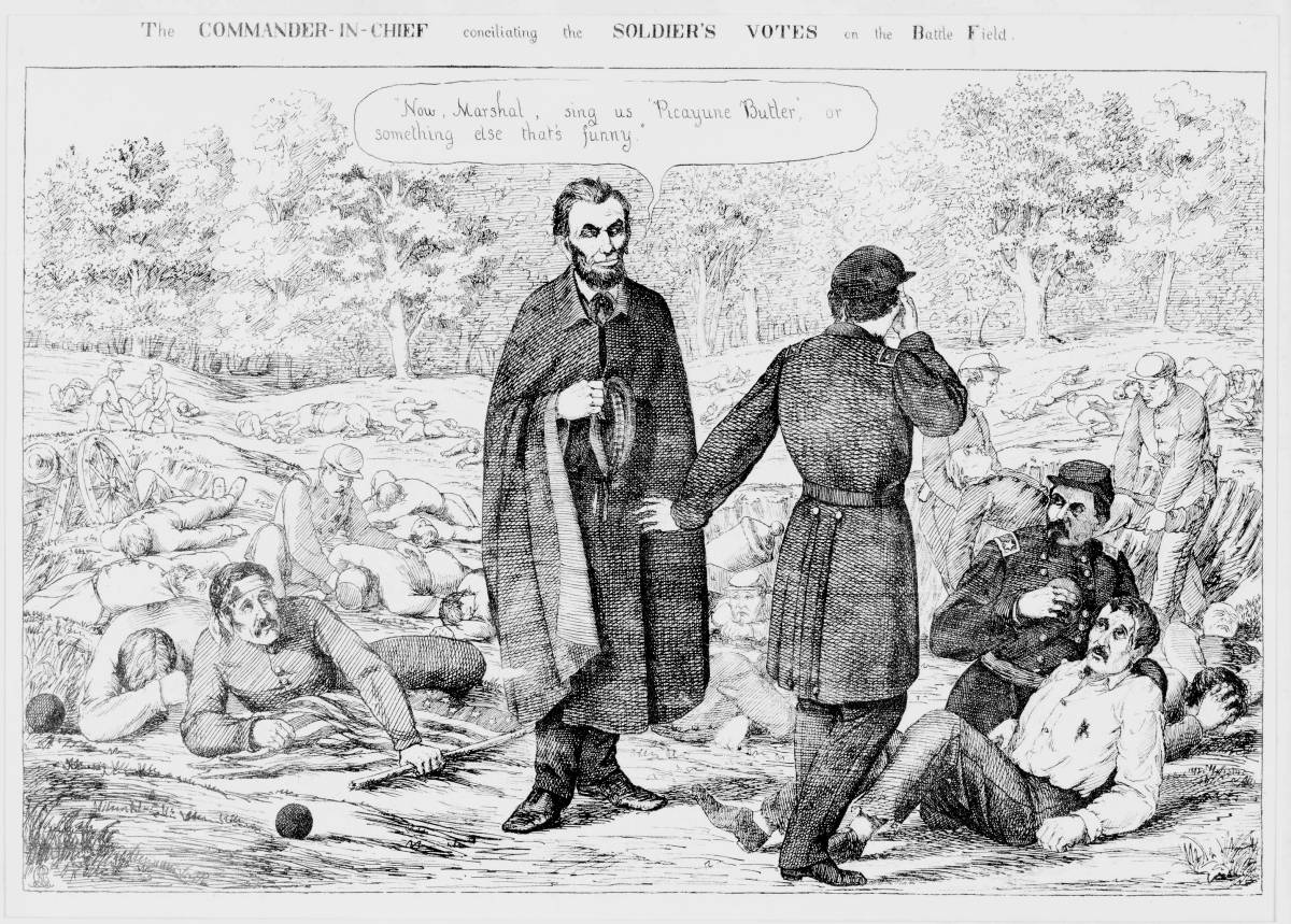 At the 1862 Battle of Antietam, Lincoln believed that McClellan has allowed Lee’s army to escape destruction. Not long after that battle, the two look tense in the general’s tent. In 1864, McClellan ran against Lincoln; this cartoon repeats the Scotch bonnet story. Lincoln’s nightmare depics the general ascending to the presidency.