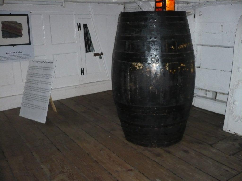 –Nelson died on the orlop deck of HMS Victory, the 104-gun ship still on display in Portsmouth. But in 1805, it was a long voyage (Victory had been mostly dismasted) back to England. What to do with his lordship? It was decided to insert him into an empty ship’s cask and then fill the cask with brandy to preserve the body. It worked. Mostly. On lying in state, Nelson’s face had to be covered with a handkerchief; the rest of him was in his full-dress uniform. He’s buried in a massive tomb in St. Paul’s that belies the actual size of its occupant. Elizabeth and I saw the funeral barge that carried his coffin to St. Paul’s. In the novel Hornblower and the Atropos, the junior captain is in charge of the barge when it begins to take on water from the Thames. Hornblower and the barge crew make it to the cathedral, but not before he suffers the most epic panic attack, I think, ever recorded in fiction.