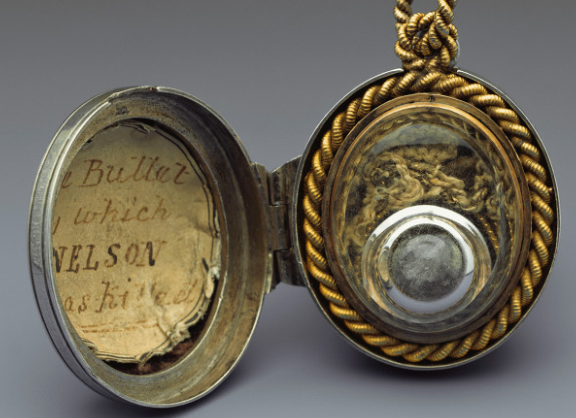 The musket ball was removed by Victory’s surgeon. It wound up preserved in this locket, surrounded by gold braid taken from the little admiral’s dress coat. (He was somewhere between 5’4″ and 5’7″.)