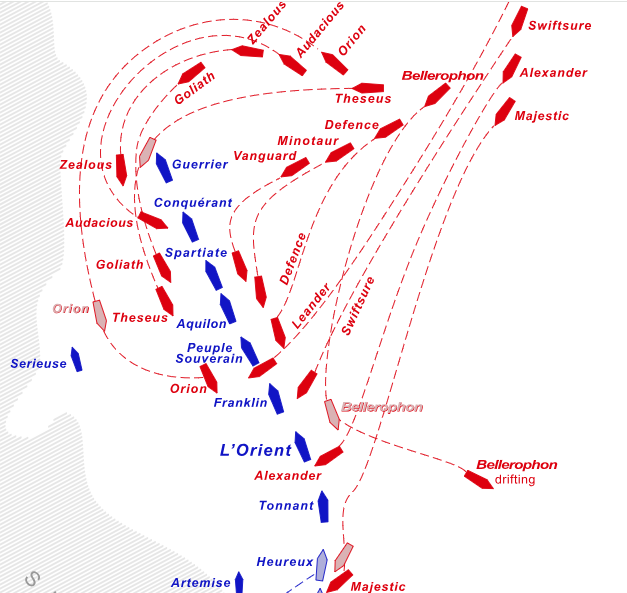 –Nelson was awarded that hat accessory after his victory over a French fleet at Aboukir Bay in Egypt. What came to be called “The Nelson touch”—shameless audacity—was in full display at Aboukir Bay. The French had anchored their fleet just beyond shoal waters, so shallow that no attacking ship would dare enter. They were wrong. Nelson divided his fleet, sending half into the shallowest part of the bay. Another column of British ships attacked the seaward side of the French ships, meaning that all of the French guns, port and starboard, were very, very busy that day. The British lost 218 sailors at what came to be called the Battle of the Nile. The French lost over 5,000. The fleet was there, by the way, in support of Napoleon’s invasion of Egypt. After Nelson’s victory, the Emperor, as he would do in the retreat from Moscow, abandoned his army and went back to Paris.