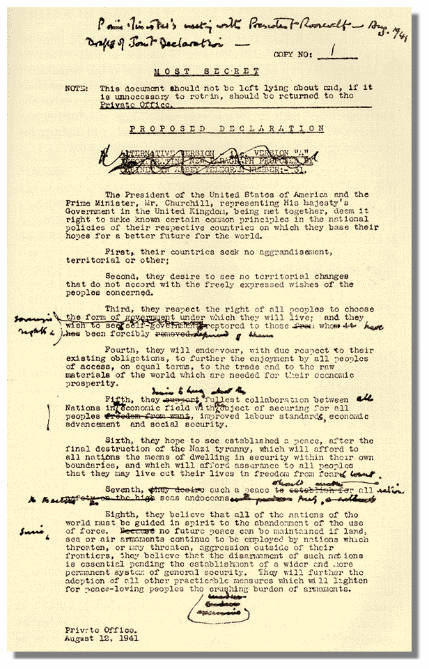 The loss of Prince of Wales would have resonance in America, waiting to learn about the destruction wreaked on the American base at Pearl Harbor. The British battleship represented the birth of the Anglo-American alliance that seems to be in grave danger today. It was on Prince of Wales, off the coast of Newfoundland, where Winston Churchill and Franklin Roosevelt met—in person, for the first time— for a conference that concluded with the issuing of The Atlantic Charter, a set of principles that seem to be in grave danger, as well. This is Churchill’s annotated copy: