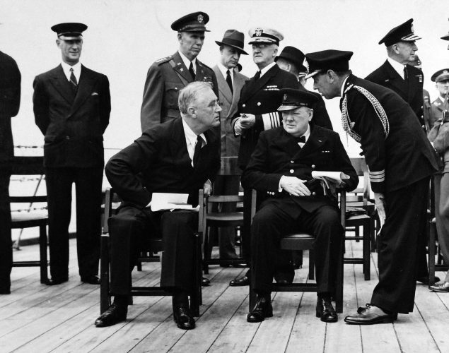 FDR and Chuchrill aboard Prince of Wales. Gen. George Marshall is just behind the president.