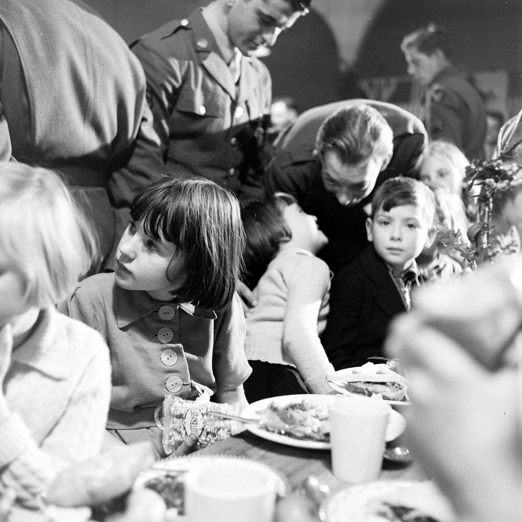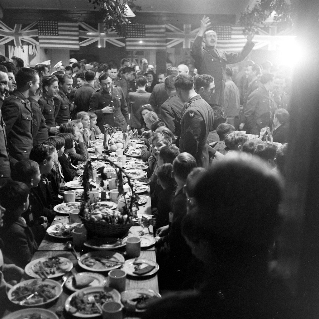 Two photos show a grander Thanksgiving celebration, with Army Air Forces officers in conversation with their little guests.