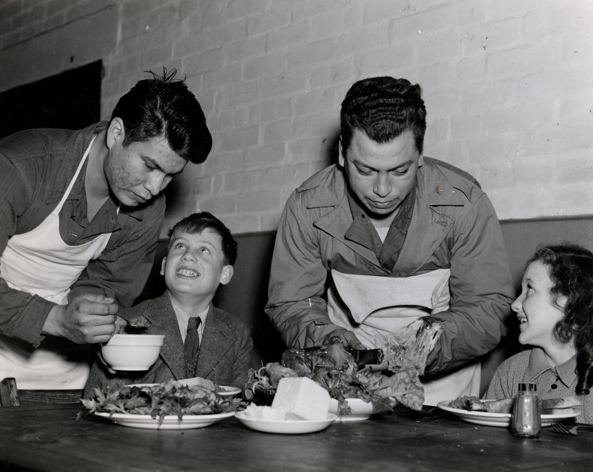 Joseph Sleeping Bear, on the left, helps to serve a Thanksgiving meal to British kids.