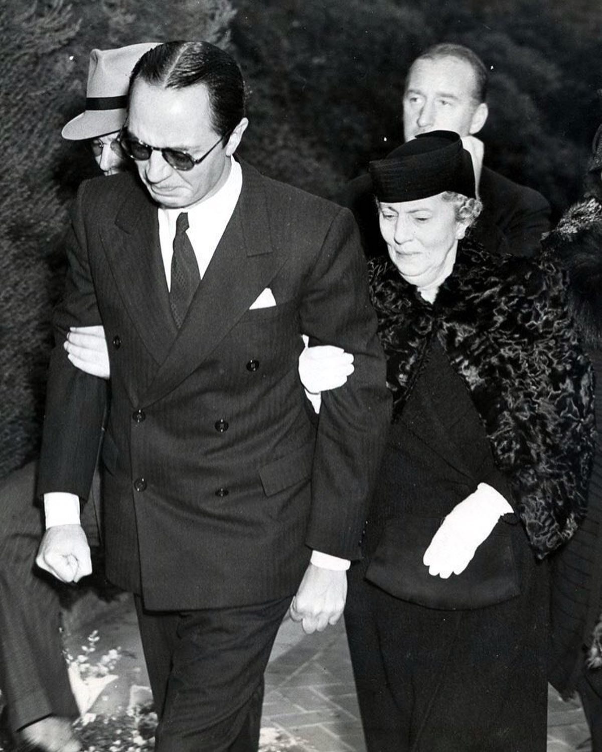 Powell and Loy weren’t married, of course. The woman who wanted to marry the impossibly suave Powell was the actress Jean Harlow. They spent time together at Hearst Castle, where Harlow continued her courtship. Powell wasn’t ready for that kind of commitment. When Harlow died of kidney failure in 1937, the impact on Powell, seen here with his mother at Jean’s funeral, was overwhelming. He had lost the love of his life.