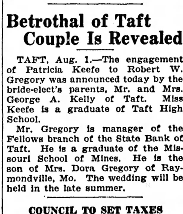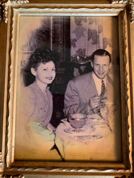 They met in 1939, when this storefront was a sweet shop/soda fountain owned by Mom’s parents, the Kellys. Dad ordered a banana split, struck up a conversation and the little newspaper clip, from July 1940, shows what followed. It’s true that my young father, only 22, was the manager of the Fellows Bank of America. He was also the teller and the janitor.