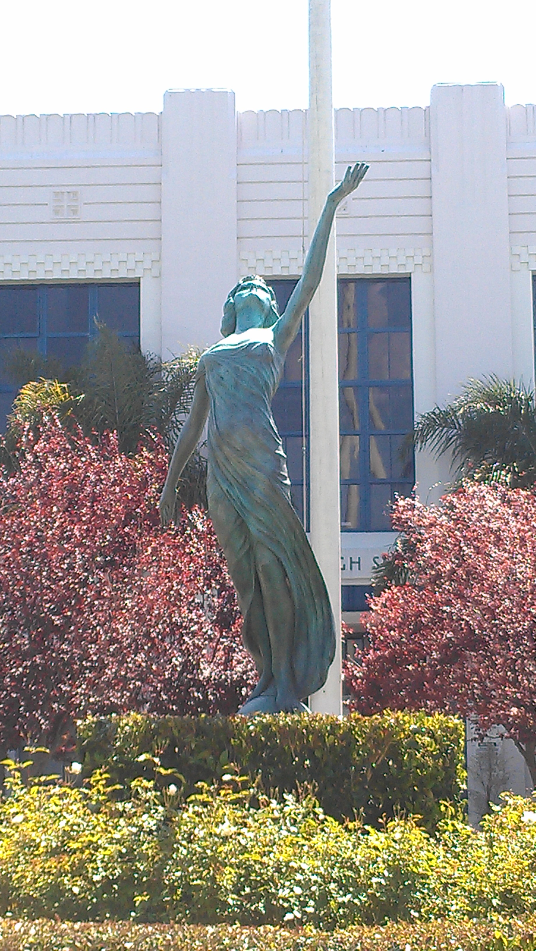 I’m not alone in my admiration for Myrna Loy. That’s her in the statue in front of her Alma Mater, Venice High. My students and I visited the Frank home in Amsterdam many years ago. In Anne’s room, inside the Secret Annex, she’d cut a photo of Loy from a movie magazine and glued it to the wall. It was still there, carefully preserved beneath plexiglass.