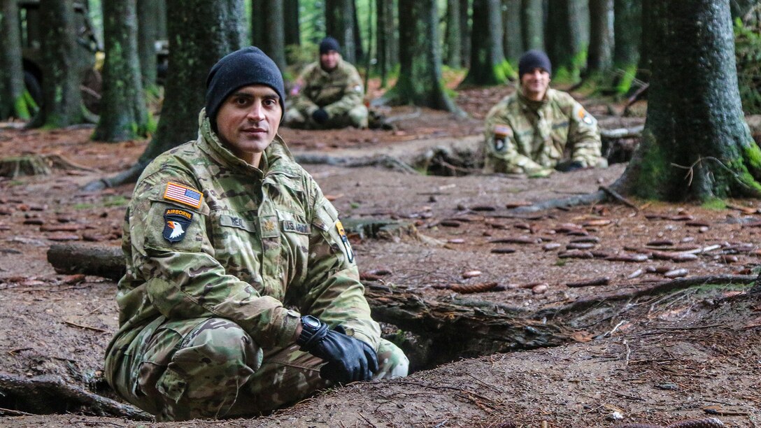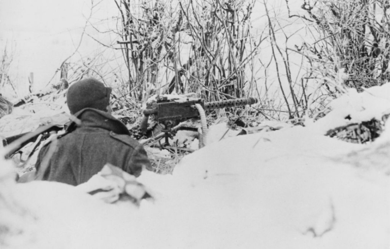 (Above): A 101st machine gunner in his foxhole; 101st soldiers in the 1944 foxholes their comrades had dug. This photo was taken 75 years after the Bulge.