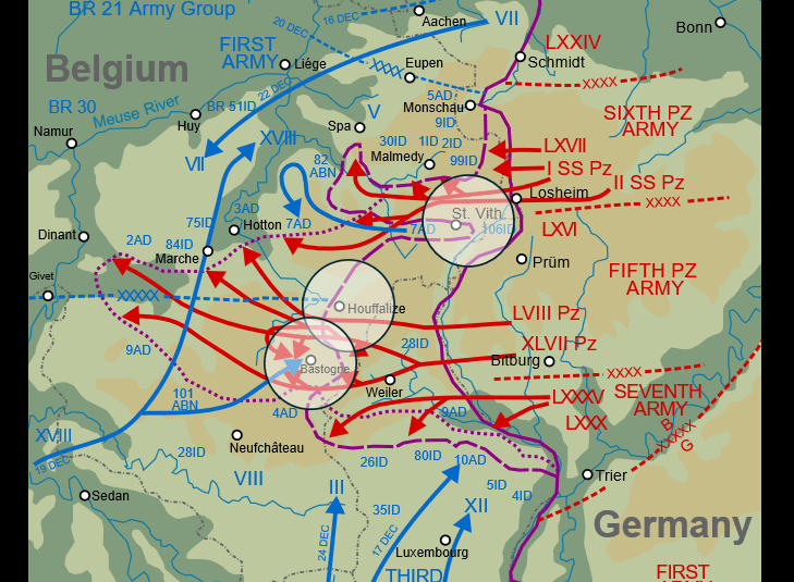 The “Bulge,” in the dotted line, indicates the depth of the German assault, intended to drive a wedge between the American and British armies and drive to the Channel.