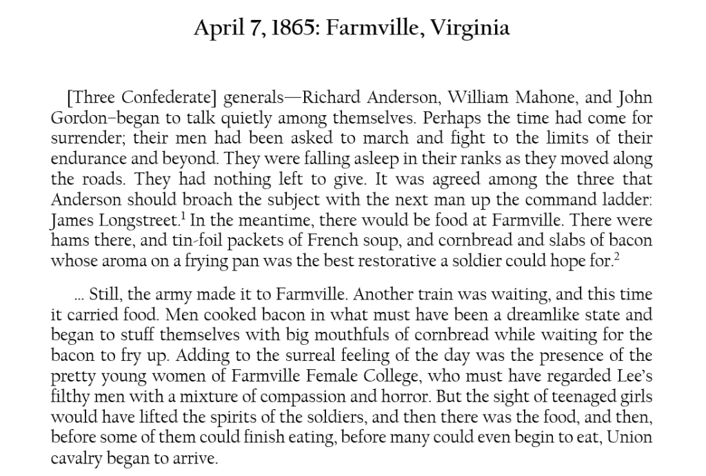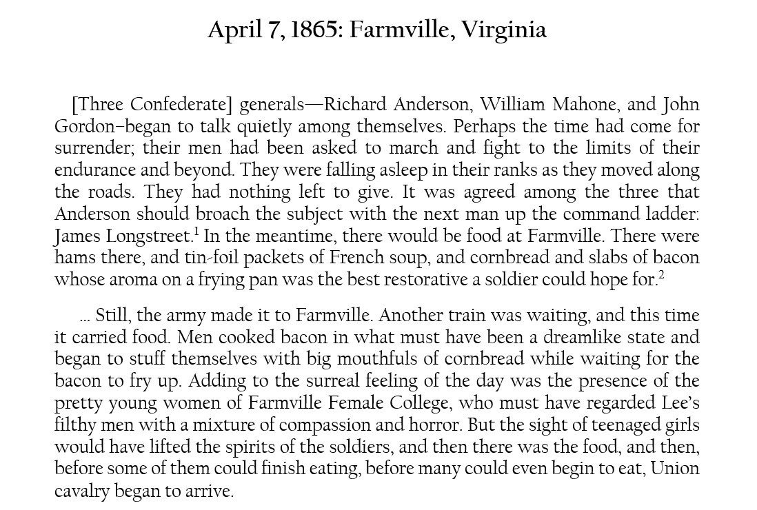 It’s hard to imagine him as a seventeen-year-old cavalryman, but our Dr. Clark fought under George Custer in April 1865. He interrupted the meal on April 7 at Farmville. Lee got his men on the move, toward a hamlet, Appomattox Court House, where a trainload of food awaited.
