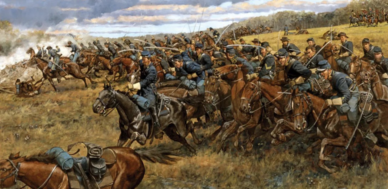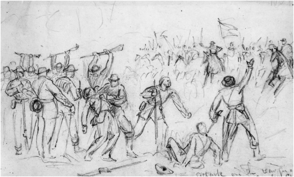 Combat artist Alfred Waud sketched Confederates surrendering in the face of a cavalry attack during the Appomattox Campaign. Library of Congress.