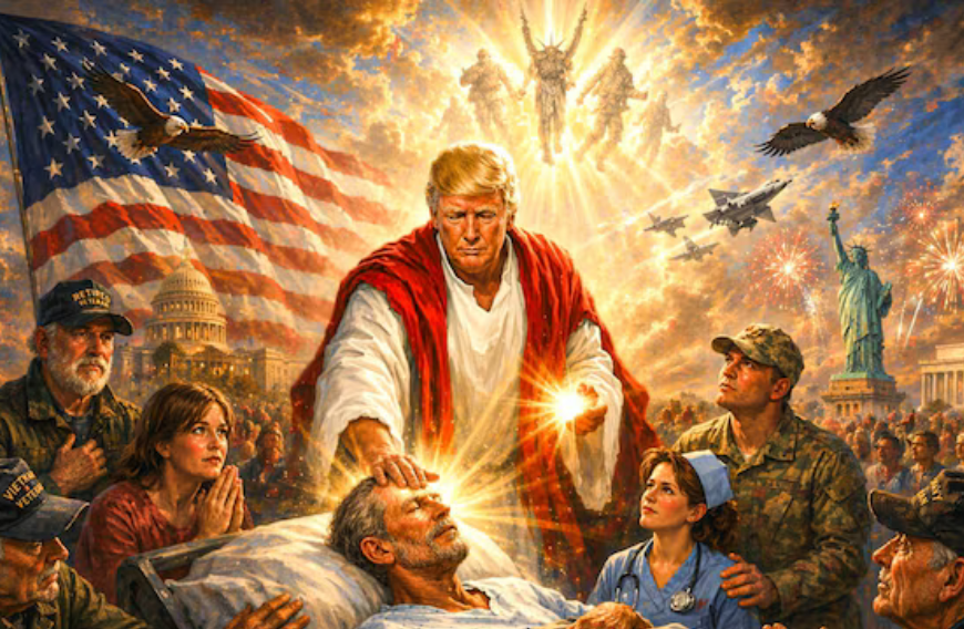 Today our president,* as part of his snit with Pope Leo, who is being stubbornly Christian, posted an image of himself as Christ, healing a sick man who appears to be Comedy Central’s Jon Stewart. It is so offensive that I will try to make it as small as possible.