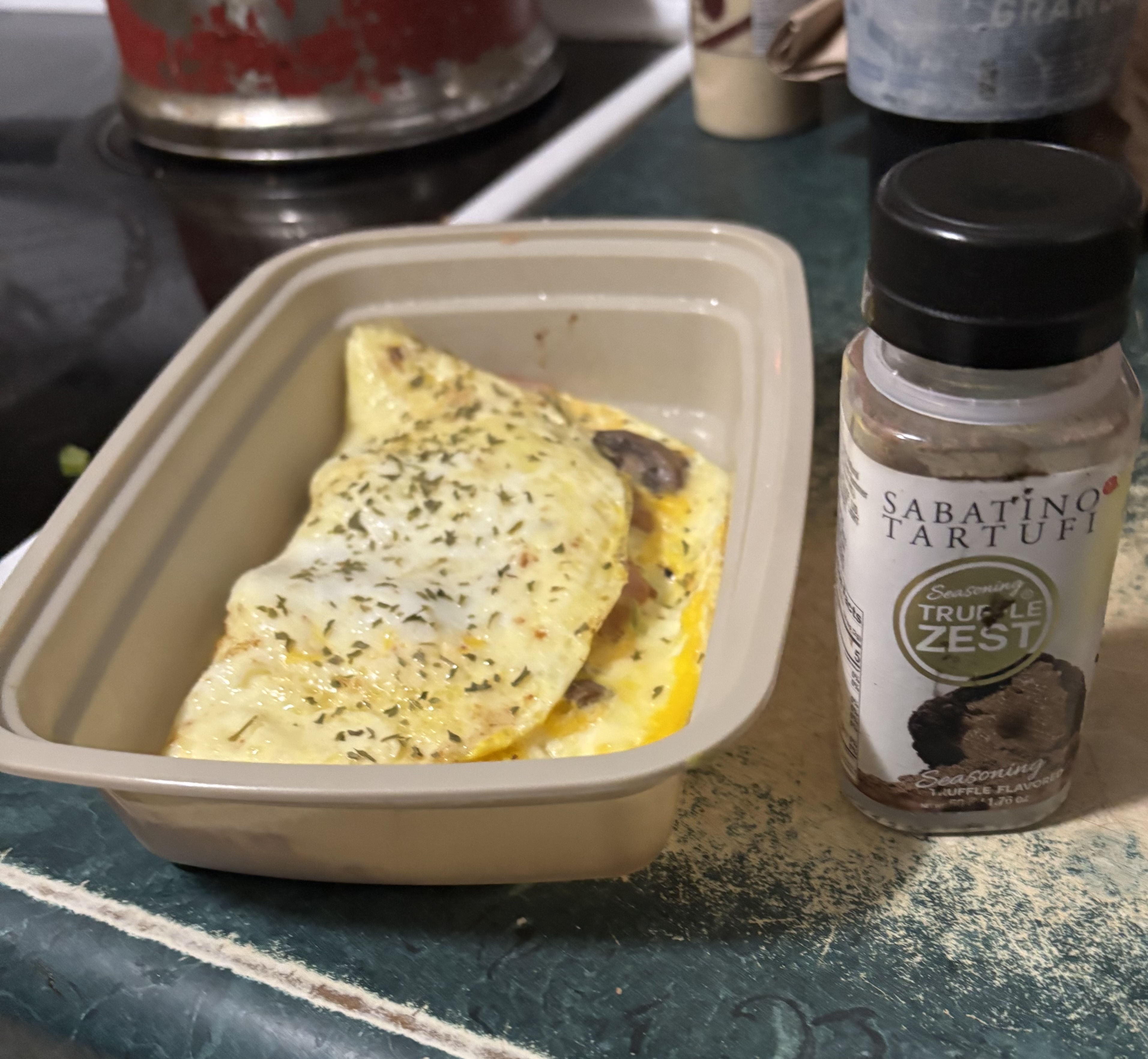 By golly, that’s not bad. A 2 1/2 egg omelet (eggs and egg whites) with cheese, sauteed bacon, peppers, mushrooms and red onions. I made three of ’em for Elizabeth and our sons. The magic ingredient is that truffle spice. It goes on the inside. Parsley flakes on the outside. Ciabatta bread with avocado spread added to the omelet.